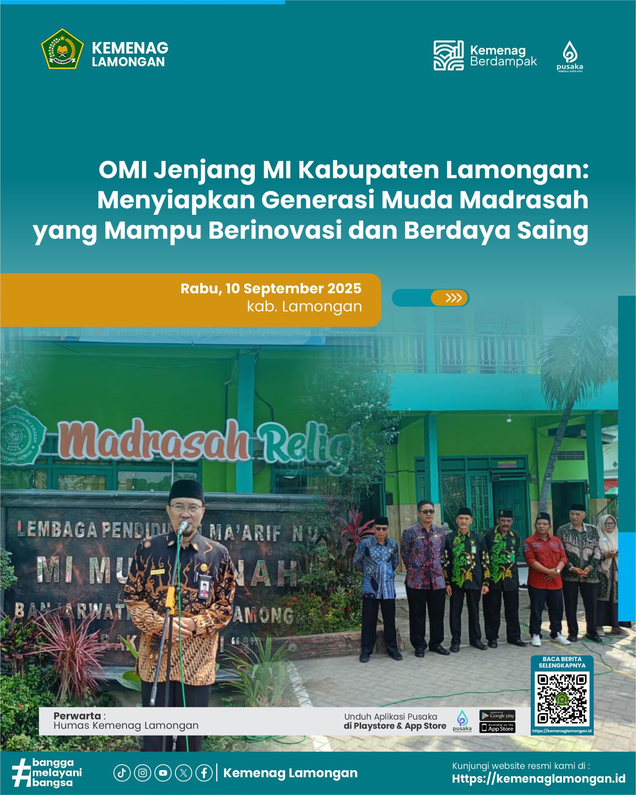 Read MoreOMI Jenjang MI Kabupaten Lamongan: Menyiapkan Generasi Muda Madrasah yang Mampu Berinovasi dan Berdaya Saing Lamongan – Bertempat di MI Mu’awanah, Kecamatan Paciran, Kabupaten Lamongan, telah digelar Olimpiade Madrasah Indonesia (OMI) jenjang Madrasah Ibtidaiyah (MI) tingkat kabupaten pada hari Rabu, 10 September 2025. Kegiatan yang bertajuk Menyiapkan Generasi Muda Madrasah Yang Mampu Berinovasi ini diikuti…