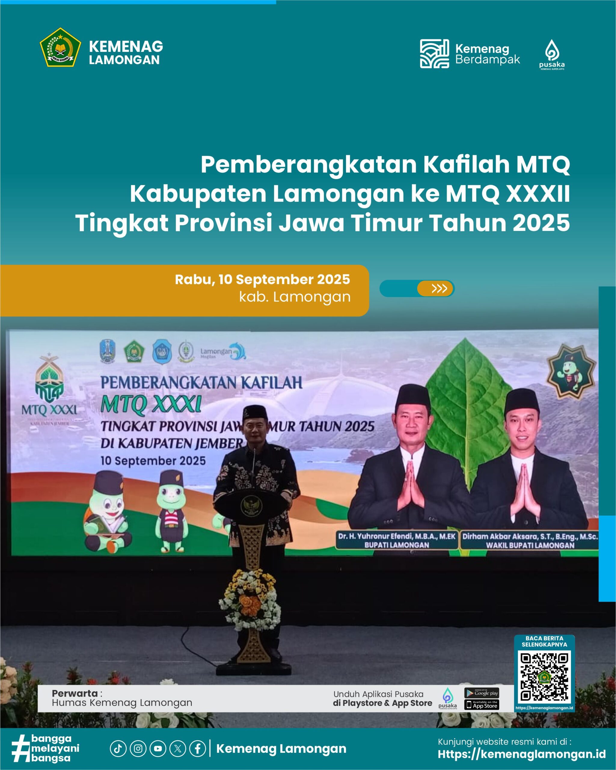 Lamongan, 10 September 2025 – Bertempat di Pendopo Lokatantra Lamongan, telah dilaksanakan acara Pemberangkatan Kafilah Musabaqah Tilawatil Qur’an (MTQ) Kabupaten Lamongan yang akan mengikuti MTQ XXXII Tingkat Provinsi Jawa Timur Tahun 2025 di Kabupaten Jember. Acara tersebut dihadiri oleh Bupati Lamongan H. Yuhronur Efendi, Wakil Bupati Dirham Akbar Aksara, Sekretaris Daerah H. Nalikan, Asisten I H. Joko Nursiyanto, Kepala Kantor Kemenag Lamongan, Kasubbag Tata Usaha Kemenag, para Kepala Seksi, Penzawa, Pembina, Pendamping dan seluruh Kafilah MTQ Kabupaten Lamongan.