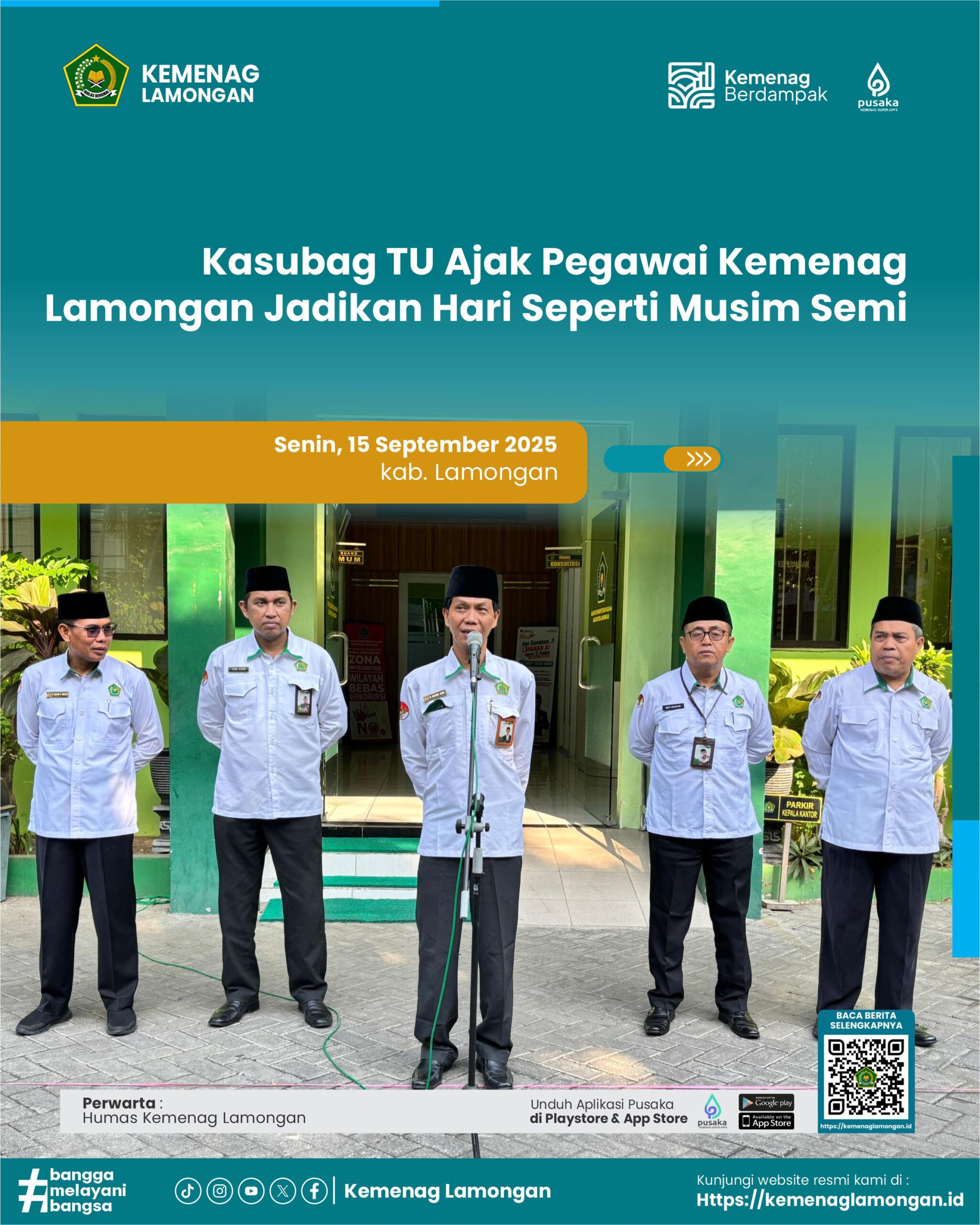 Lamongan, 15 September 2025 — Dalam apel pagi Senin (15/9/2025), Kepala Sub Bagian Tata Usaha Kantor Kementerian Agama Kabupaten Lamongan, M. Khoirul Anam, memberikan sambutan pembinaan kepada seluruh pegawai.