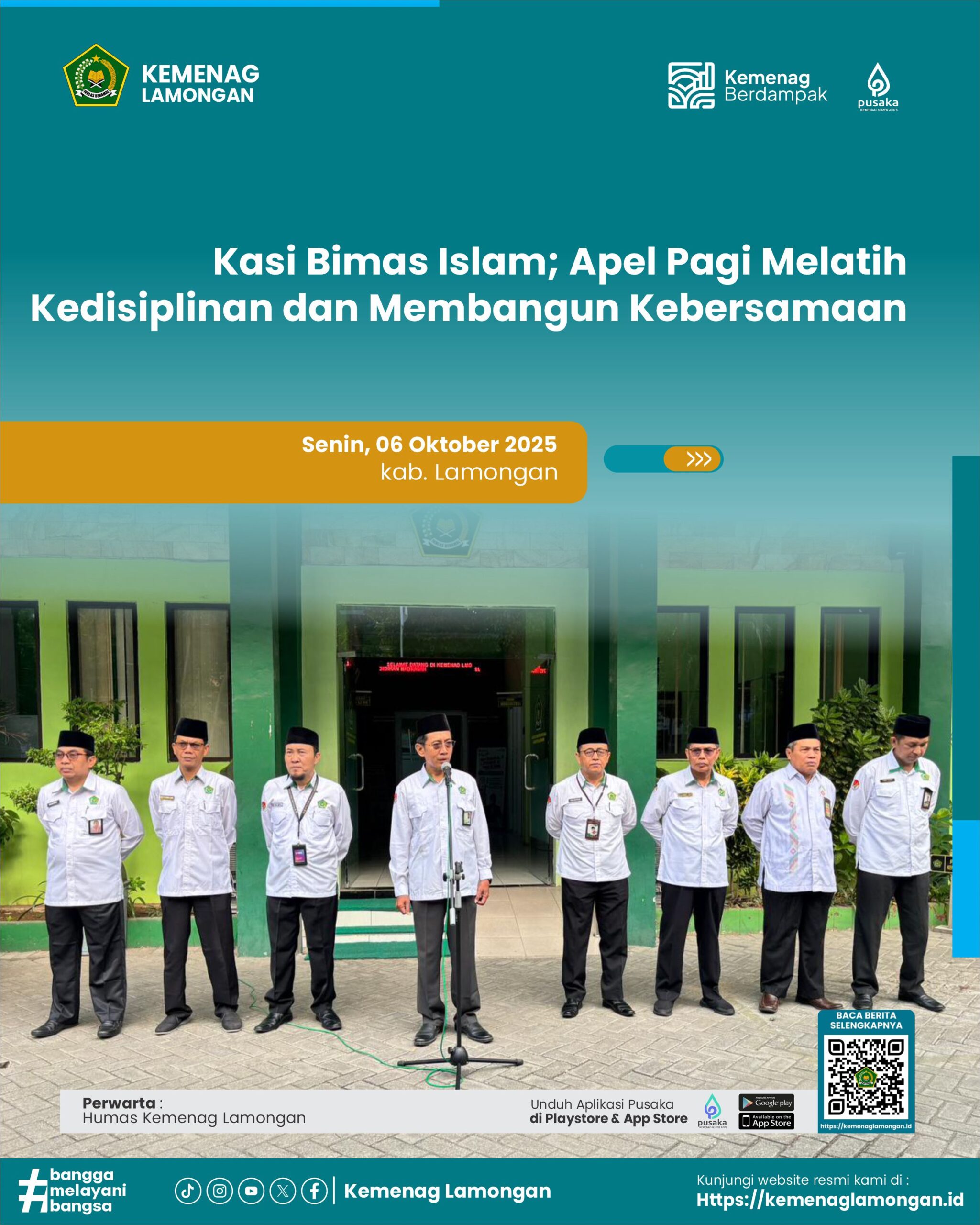 Lamongan – Bertempat di halaman Kantor Kementerian Agama Kabupaten Lamongan, telah dilaksanakan apel rutin pada Senin, 6 Oktober 2025. Apel ini diikuti oleh Kepala Kantor Kemenag, Kasubbag Tata Usaha, para Kepala Seksi, Penyelenggara Zakat dan Wakaf, Pengawas Madrasah tingkat Menengah, serta seluruh ASN di lingkungan Kantor Kementerian Agama Kabupaten Lamongan.