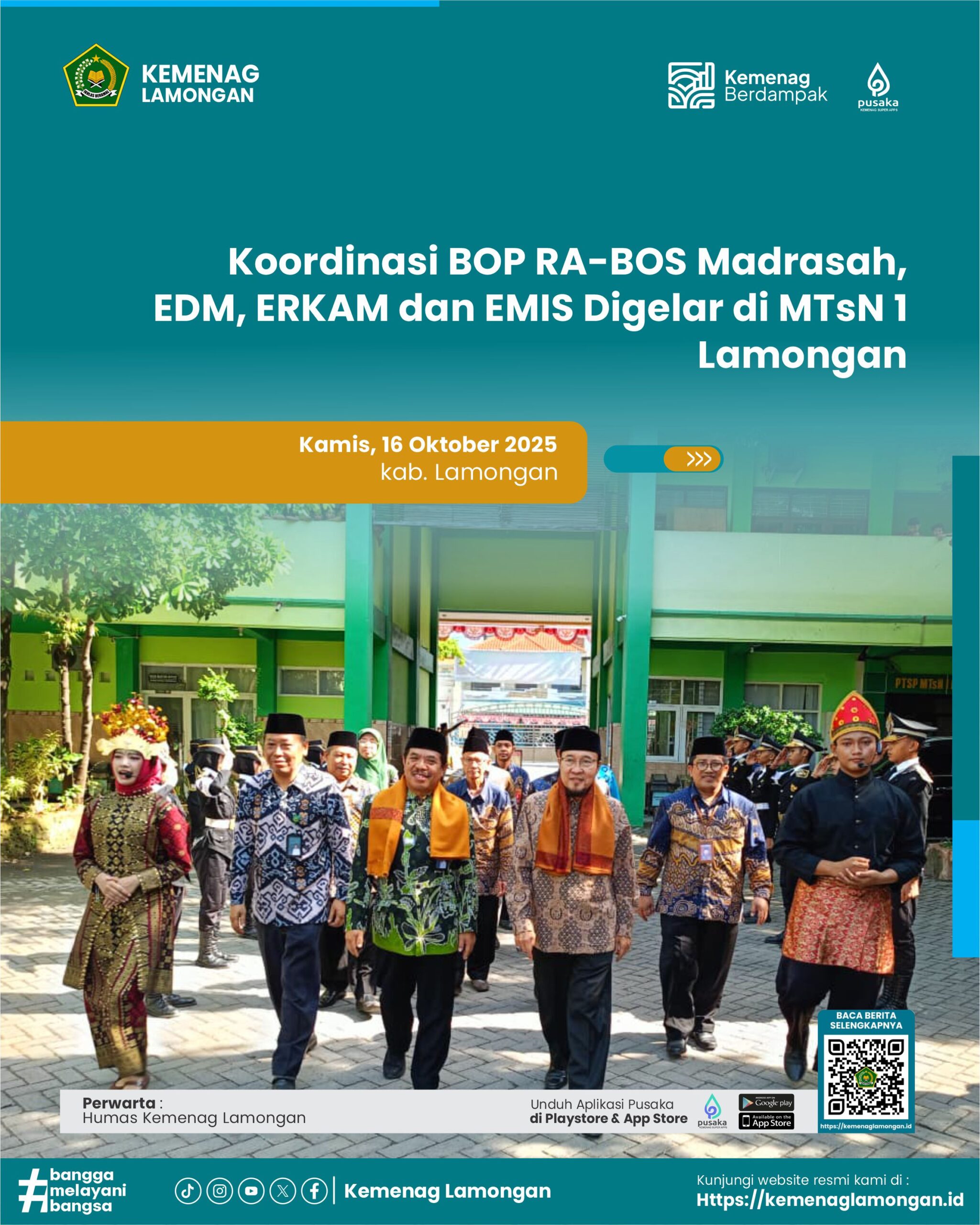 Read MoreKoordinasi BOP RA-BOS Madrasah, EDM, ERKAM dan EMIS Digelar di MTsN 1 Lamongan Lamongan, 16 Oktober 2025 — Bertempat di Aula Madrasah Tsanawiyah Negeri (MTsN) 1 Lamongan, telah dilaksanakan kegiatan Koordinasi terkait Bantuan Operasional Pendidikan (BOP) RA dan BOS Madrasah, Evaluasi Diri Madrasah (EDM), Elektronik Rencana Kerja dan Anggaran Madrasah (ERKAM), Education Management Information System…