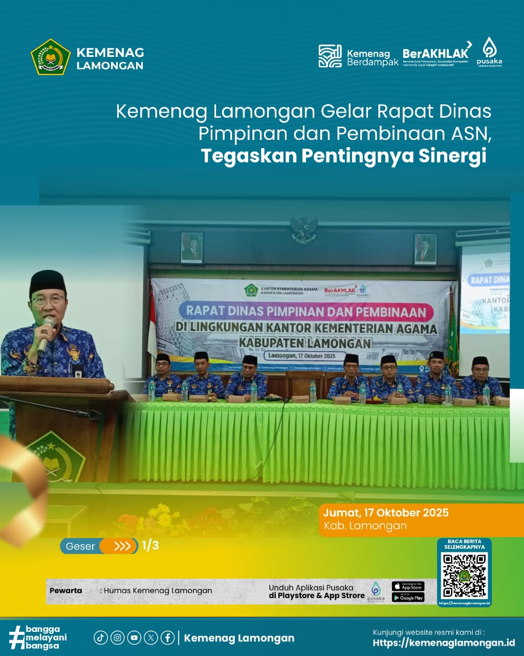 Lamongan, 17 Oktober 2025 — Kantor Kementerian Agama Kabupaten Lamongan menyelenggarakan kegiatan Rapat Dinas Pimpinan dan Pembinaan ASN yang berlangsung di Aula Utama Kantor Kemenag Lamongan, pada Jumat (17/10). Kegiatan ini dihadiri oleh Kepala Kantor Kemenag Lamongan, Kasubbag Tata Usaha, para Kepala Seksi, Penyelenggara Zakat dan Wakaf, para Kepala KUA, Pengawas Madrasah dan PAI, Kepala Madrasah Negeri beserta Wakil Kepala Sarpras, Penyuluh Agama Fungsional, serta seluruh ASN di lingkungan Kemenag Lamongan.