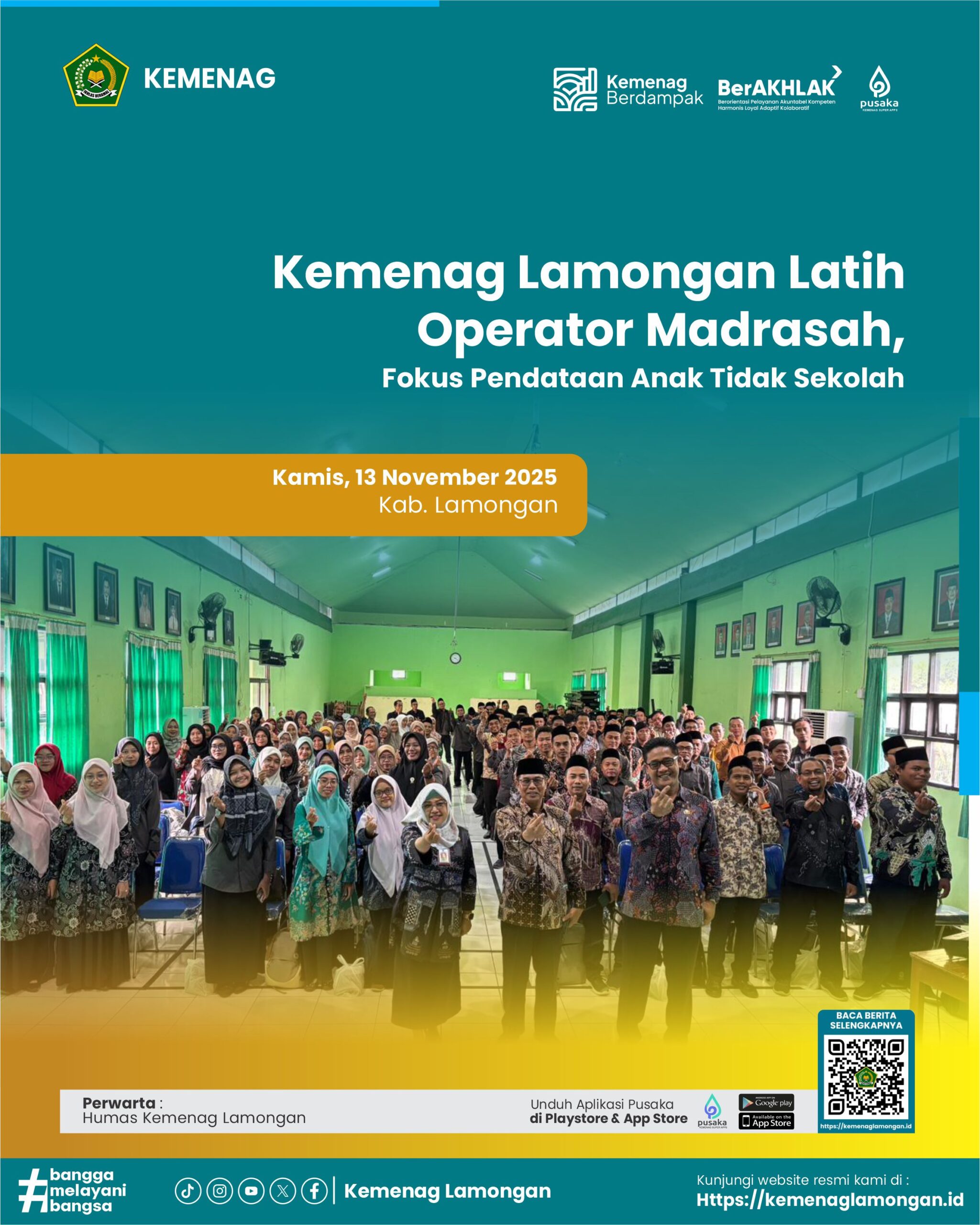 Read MoreKemenag Lamongan Latih Operator Madrasah, Fokus Pendataan Anak Tidak Sekolah Kantor Kementerian Agama (Kemenag) Kabupaten Lamongan mengadakan Sosialisasi Penanganan Anak Tidak Sekolah (ATS) untuk mendukung program wajib belajar 13 tahun.Kegiatan yang diikuti oleh operator EMIS jenjang MTs se- Kab. Lamongan ini dibuka oleh Kepala Seksi Pendidikan Madrasah (Kasi Penma) Kemenag Lamongan, H. Banjir Sidomulyo, di…