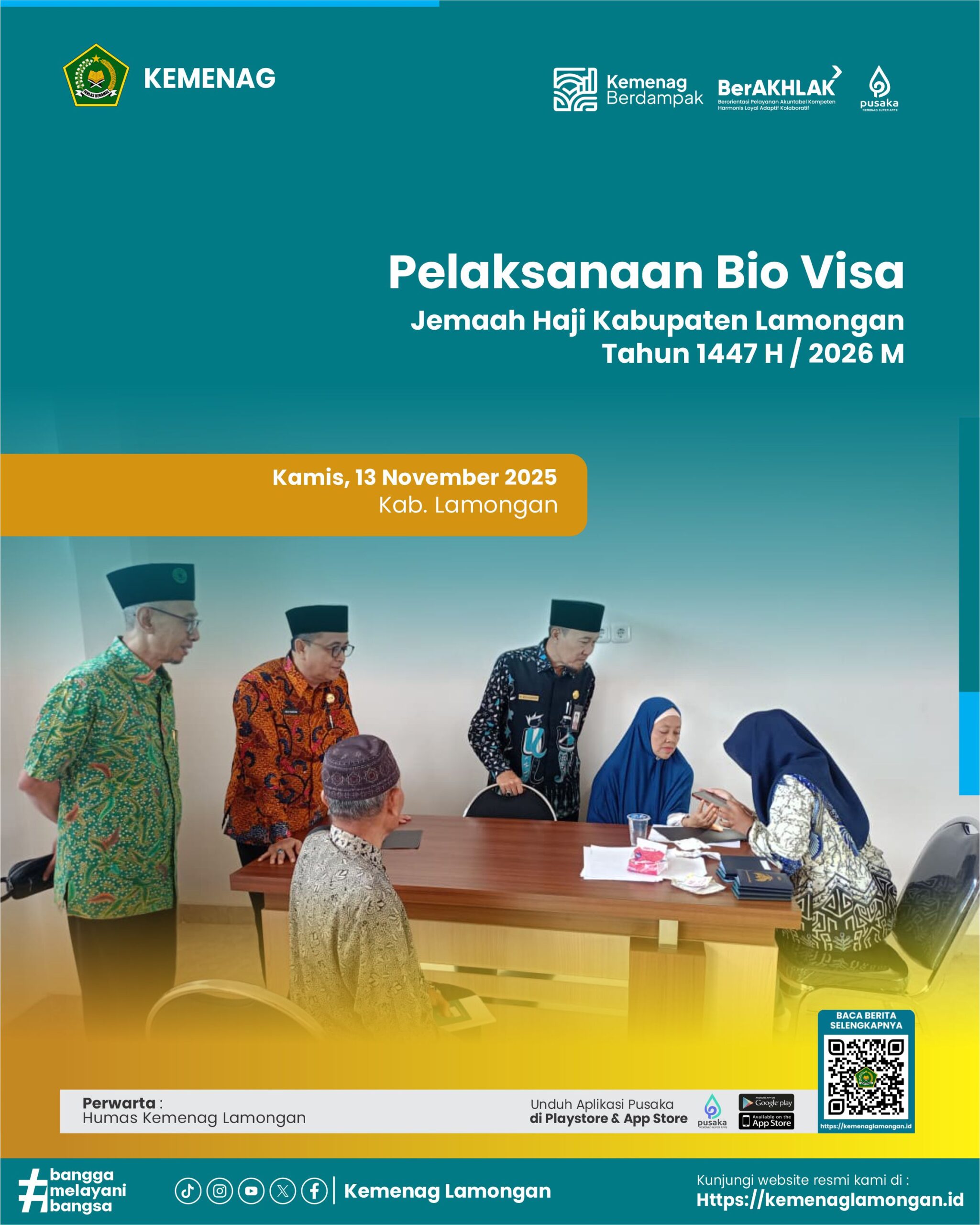 Read MorePelaksanaan Bio Visa Jemaah Haji Kabupaten Lamongan Tahun 1447 H / 2026 M Kepala Kankemenag Kab Lamongan H Mohammad Muhlisin Mufa dan Kasi PHU Kemenag Lamongan, H. Abd. Ghofur hadir dalam kegiatan Bio Visa Jemaah Haji Kabupaten Lamongan yang dilaksanakan di Gedung PLHUT (Pusat Layanan Haji dan Umrah Terpadu) Lamongan.Kegiatan ini merupakan bagian dari proses…