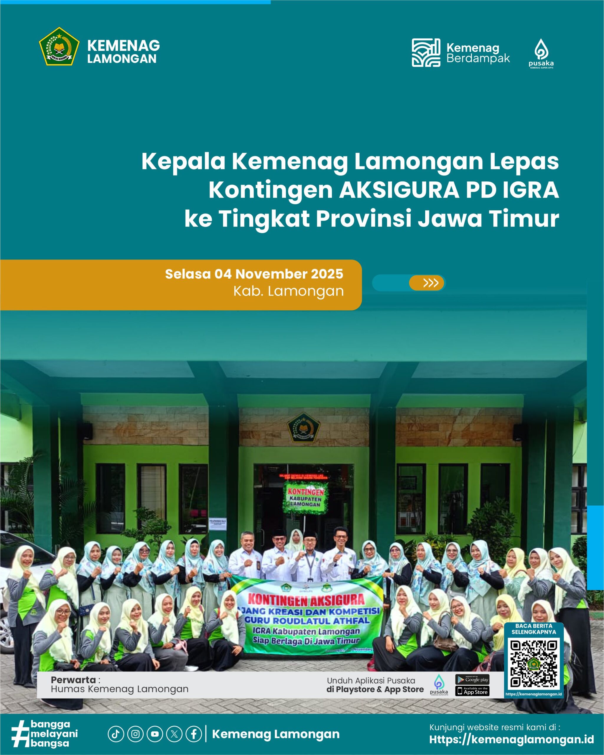 Read MoreKepala Kemenag Lamongan Lepas Kontingen AKSIGURA PD IGRA ke Tingkat Provinsi Jawa Timur Lamongan, 4 November 2025 – Kepala Kantor Kementerian Agama (Kankemenag) Kabupaten Lamongan, H. Mohammad Muhlisin Mufa, secara resmi melepas Kontingen AKSIGURA PD IGRA Kabupaten Lamongan menuju ajang tingkat Provinsi Jawa Timur. Acara pelepasan berlangsung di Ruang VIP Kemenag Lamongan pada Selasa (4/11/2025),…