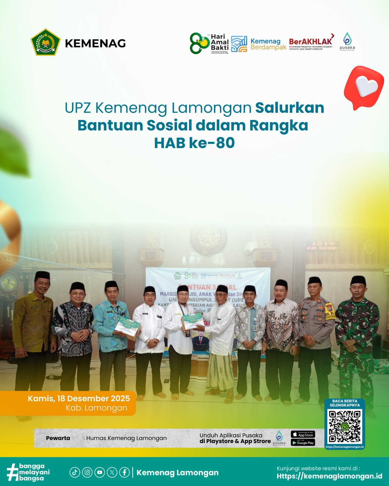 Lamongan – Unit Pengumpul Zakat (UPZ) Kantor Kementerian Agama Kabupaten Lamongan menyalurkan bantuan sosial kepada marbot masjid (di Kecamatan Karangbinangun, Glagah, dan Kalitengah), serta kepada anak yatim dan kaum dhuafa (Kecamatan Karangbinangun). Kegiatan ini dilaksanakan dalam rangka memperingati Hari Amal Bhakti (HAB) Kementerian Agama ke-80 Tahun 2026, bertempat di Masjid Al Muqorobin, Desa Sambopinggir, Kecamatan Karangbinangun, Kamis (18/12/2025).