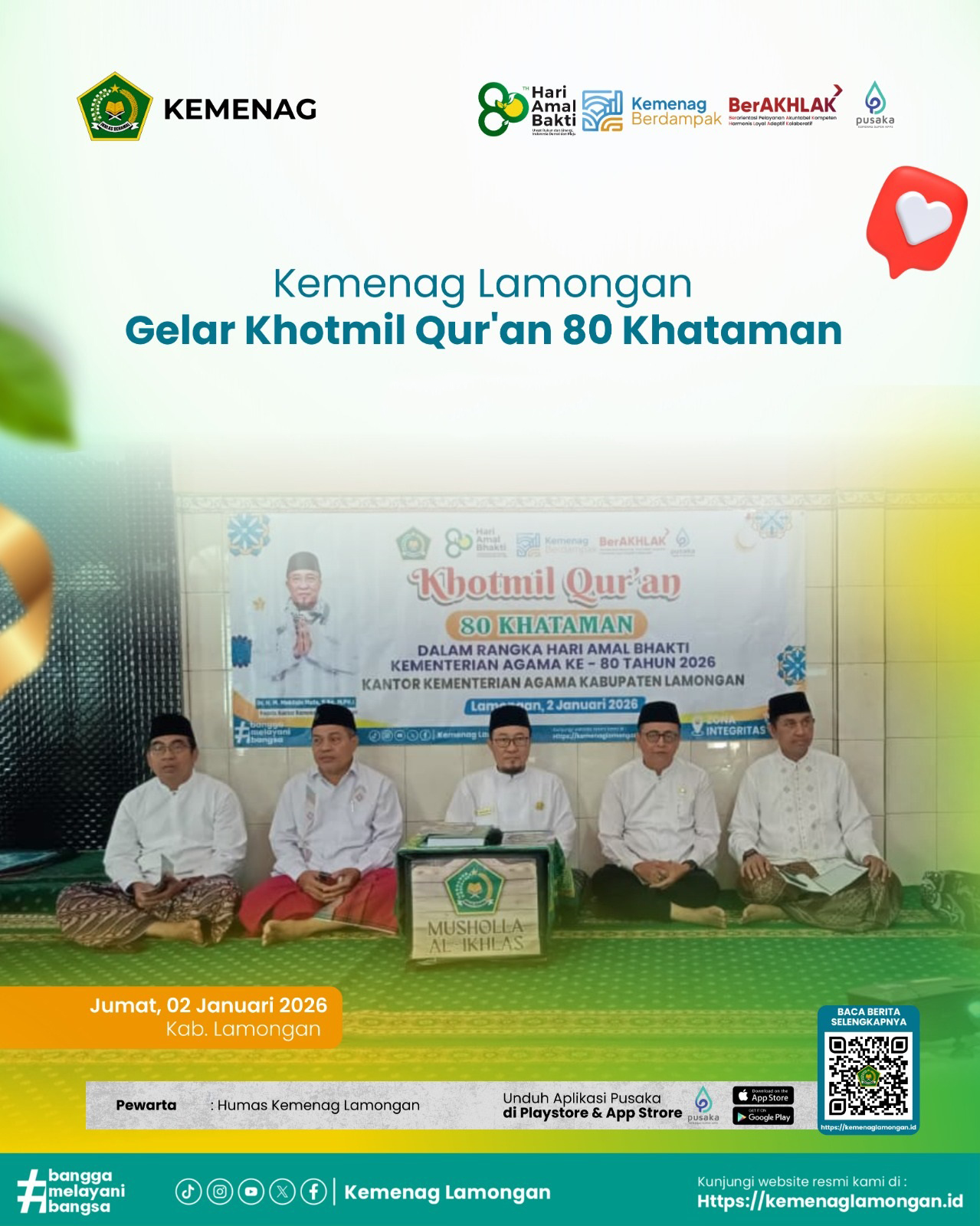Read MoreKemenag Lamongan Gelar Khotmil Qur’an 80 Khataman Lamongan — Dalam rangka memperingati Hari Amal Bakti (HAB) Kementerian Agama Republik Indonesia ke-80, Kantor Kementerian Agama Kabupaten Lamongan menggelar kegiatan Khotmil Qur’an Bil Ghoib sebanyak 80 kali khataman. Kegiatan ini diikuti oleh Kepala Kantor Kementerian Agama Kabupaten Lamongan, Kepala Kemenhaj, Kepala Subbagian Tata Usaha, para Kepala Seksi…