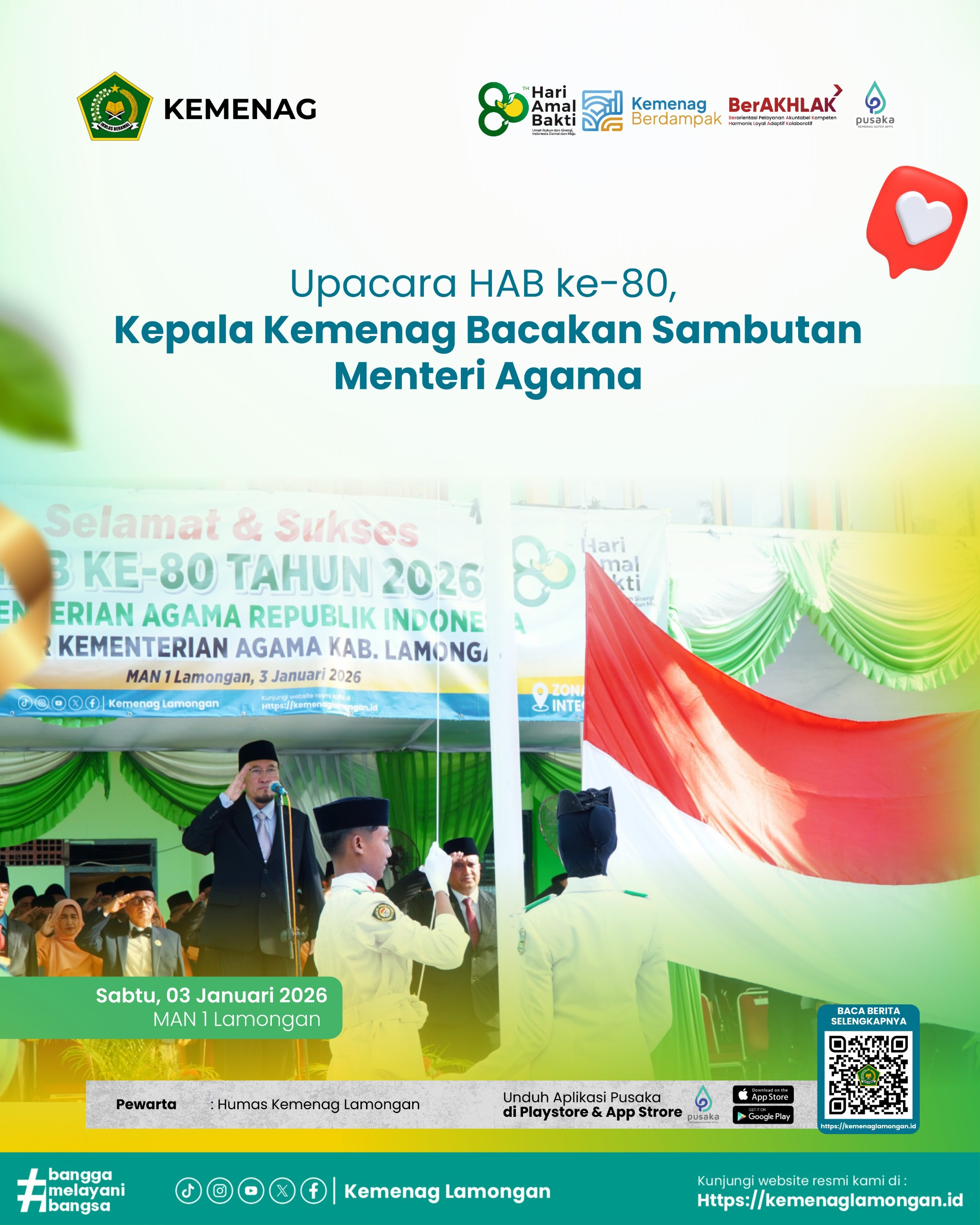 Read MoreUpacara HAB ke-80, Kepala Kemenag Bacakan Sambutan Menteri Agama Lamongan – Kantor Kementerian Agama Kabupaten Lamongan menyelenggarakan Upacara Hari Amal Bakti HAB ke-80 Kementerian Agama bertempat di Madrasah Aliyah Negeri 1 Lamongan. Kegiatan ini diikuti oleh Kepala Kemenag, Purna Tugas Pejabat, Purna Tugas Tahun 2025, Ormas, Kasubbag Tata Usaha, Jajaran Kepala Seksi, Penzawa, Kepada KUA,…