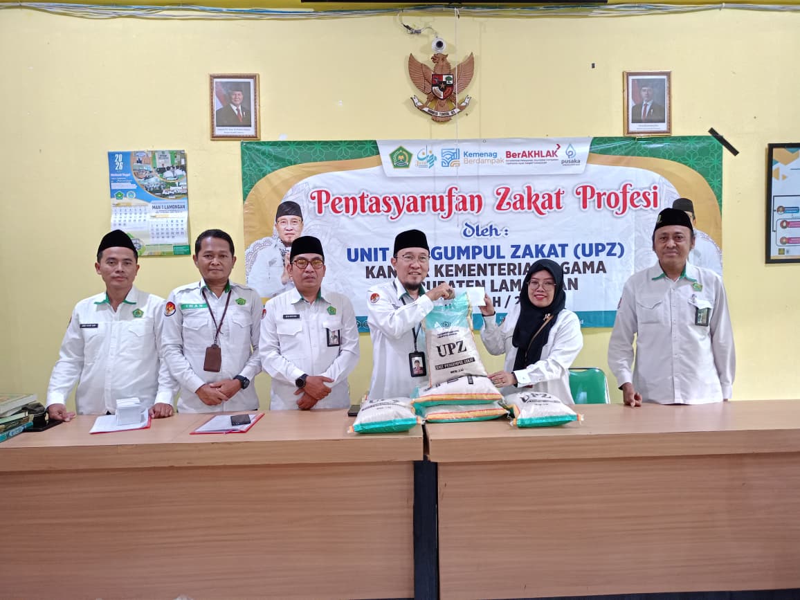Lamongan – Pentasyarufan Zakat Profesi di MAN 1 Lamongan oleh Unit Pengumpul Zakat (UPZ) Kantor Kementerian Agama Kabupaten Lamongan yang diikuti oleh Kepala Kemenag, Penyelenggara Zakat dan Wakaf, Kepala MAN 1 Lamongan serta civitas akademika MAN 1 Lamongan berlangsung dengan khidmat dan penuh semangat kebersamaan.