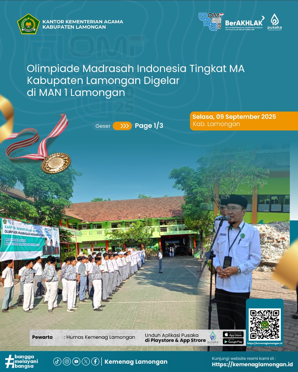 Read MoreOlimpiade Madrasah Indonesia Tingkat MA Kabupaten Lamongan Digelar di MAN 1 Lamongan Lamongan, 9 September 2025 — Olimpiade Madrasah Indonesia (OMI) jenjang Madrasah Aliyah tingkat Kabupaten Lamongan resmi digelar pada hari Selasa, 9 September 2025, bertempat di MAN 1 Lamongan. Kegiatan ini diikuti oleh para siswa dan siswi perwakilan dari seluruh Madrasah Aliyah se-Kabupaten Lamongan.…