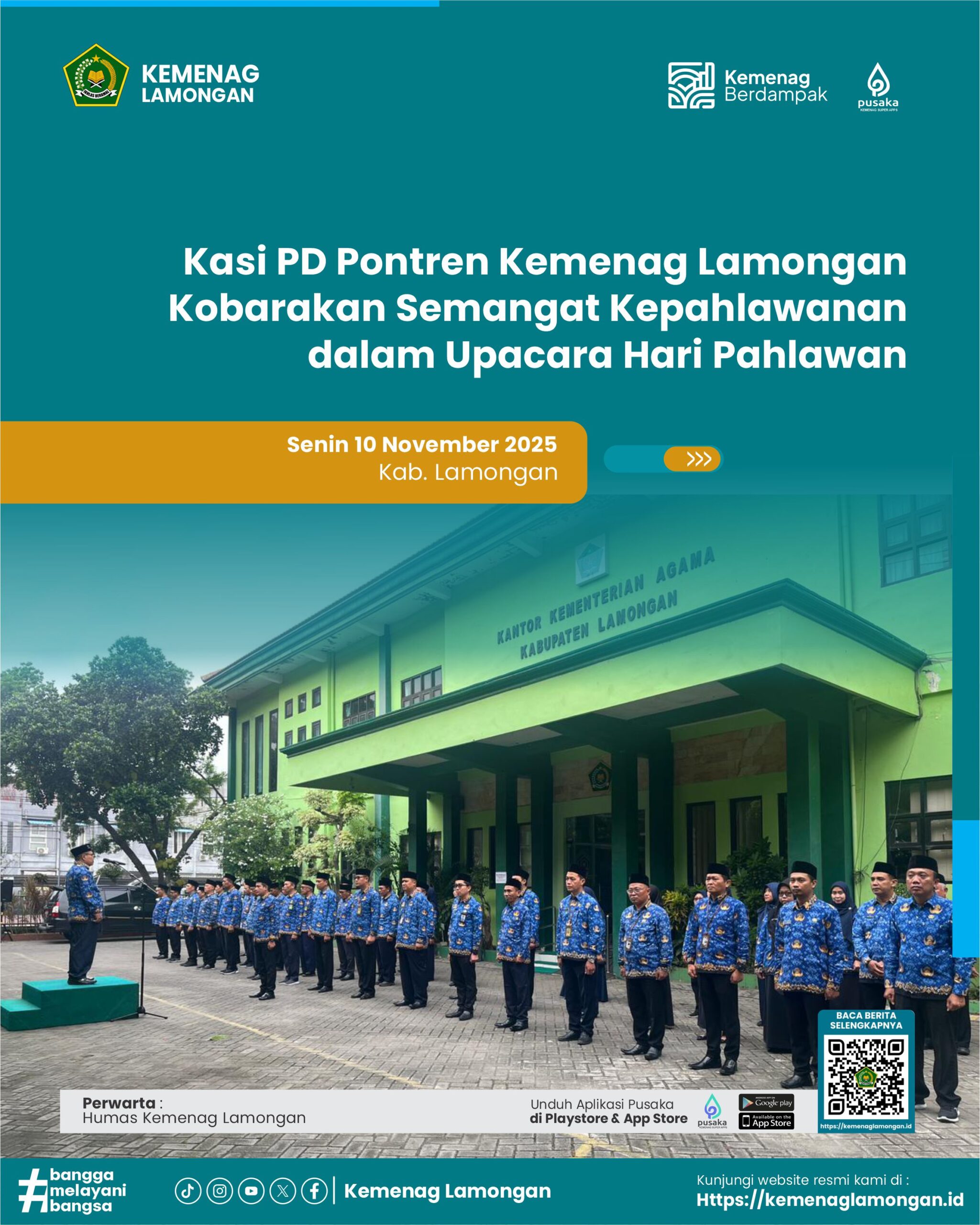 Kasi PD Pontren Kemenag Lamongan Kobarakan Semangat Kepahlawanan dalam Upacara Hari Pahlawan Lamongan – Dalam rangka memperingati Hari Pahlawan Nasional tahun 2025, Kantor Kementerian Agama Kabupaten Lamongan menggelar upacara yang berlangsung khidmat di halaman kantor pada Senin pagi, 10 November 2025. Bertindak sebagai inspektur upacara, Kepala Seksi Pendidikan Diniyah dan Pondok Pesantren Kantor Kementerian Agama…