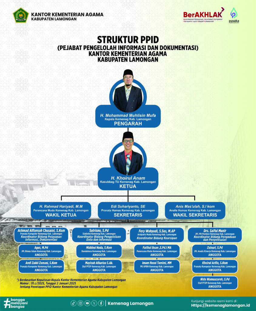 Secara garis besar Struktur PPID pada Kementerian Agama dikelompokkan menjadi dua yaitu Struktur PPID Kementerian Agama dan Struktur PPID pada masing-masing unit di Kementerian Agama (PPID Unit), dimana dalam pelaksanaannya PPID Unit dibantu oleh Panitia Pengelola dan Pelayanan Informasi pada setiap satuan kerja.